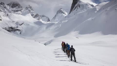 Ski, støvler, bindinger, skind, knive, rygsække, steigejern, seler, reb og sikkerhedsudstyr: lavinesøgere, skovle, sonder.
