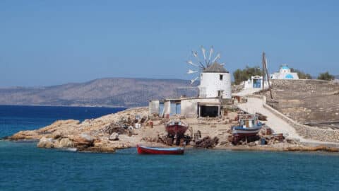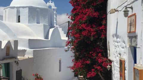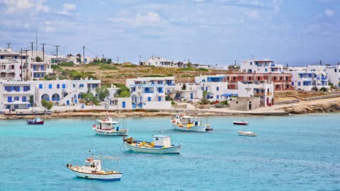 Opdagelse af byen med de typiske hvide huse fra Kykladerne.