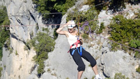 Et par vandretursko i lærred (letvægt, høj og med skridsikker sål) og et par læderhandsker til de store rappeler.