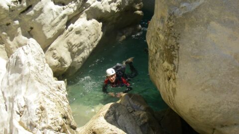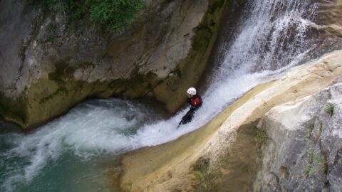 Alt udstyr kan lånes: hjelm, klatresko, våddragt og neoprenskjoler, sele, rygsæk, reb, karabinhager, nedtrapper, vandtæt dunke, våddragt osv.